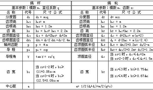 蝸桿蝸輪的主要參數有:模數m、蝸桿分度圓直徑d、導程角γ、、中心距a、蝸桿頭數z1、蝸輪齒數z2等,根據上述參數可決定蝸桿與蝸輪的基本尺寸,其中z1、z2由傳動要求選定。幾何尺寸計算如下表所示。