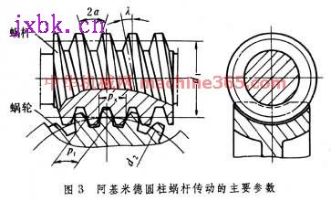主要參數 各類減速機圓柱蝸桿傳動的參數和幾何尺寸基本相同。圖3 阿基米德圓柱蝸桿減速機的主要參數 為阿基米德圓柱蝸桿減速機的主要參數。通過蝸桿軸線并垂直於蝸輪軸線的平面﹐稱為中間平面。在中間平面上﹐蝸桿的齒廓為直線﹐蝸輪的齒廓為漸開線﹐蝸桿和蝸輪的嚙合相當於齒條和漸開線齒輪的嚙合。因此﹐蝸桿傳動的參數和幾何尺寸計算大致與齒輪傳動相同﹐并且在設計和製造中皆以中間平面上的參數和尺寸為基準。