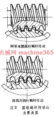 蝸輪蝸桿減速機常用的有阿基米德圓柱蝸桿傳動和圓弧齒圓柱蝸桿傳動(圖2 圓柱蝸桿傳動的主要類型 )。(1)阿基米德蝸桿的端面齒廓為阿基米德螺旋線﹐其軸面齒廓為直線。