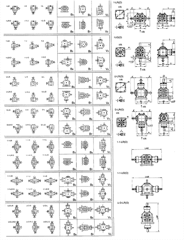 T系列螺旋錐齒輪傳動箱軸配置及軸旋轉方向的關系、安裝方位及尺寸表
